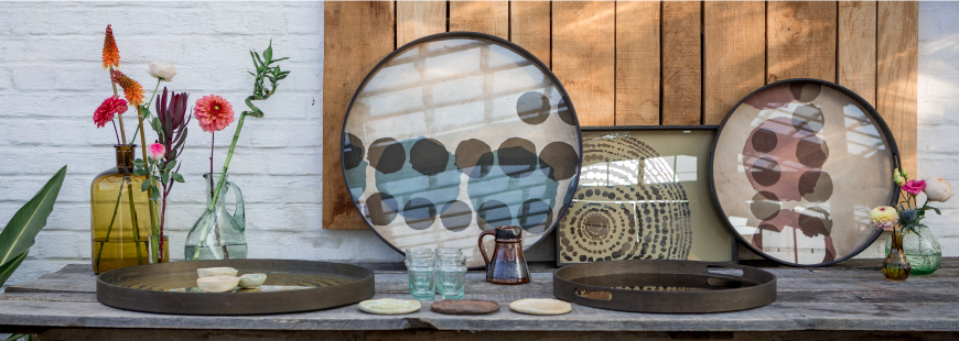 Notre Monde 的作品細緻並帶有輕奢感,托盤不僅能作為置物盤,也可以置掛在牆上,或是搭配茶几框架結合為實用的邊桌。除此之外,Notre Monde 不斷發展出復古精美的桌几、掛畫、鏡子和沙發等傢俱,兼顧了空間美學與功能性。