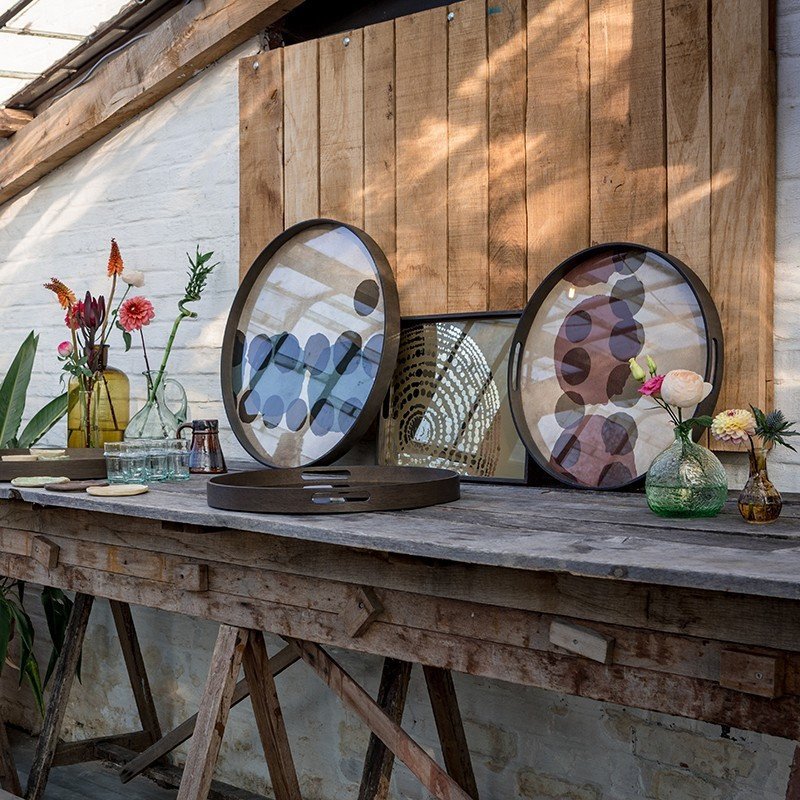 Notre Monde 的作品細緻並帶有輕奢感,托盤不僅能作為置物盤,也可以置掛在牆上,或是搭配茶几框架結合為實用的邊桌。除此之外,Notre Monde 不斷發展出復古精美的桌几、掛畫、鏡子和沙發等傢俱,兼顧了空間美學與功能性。