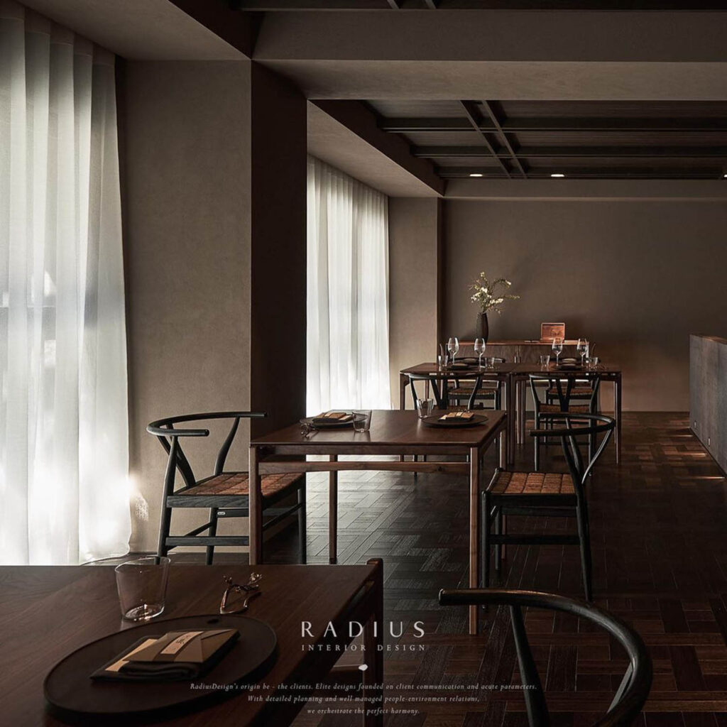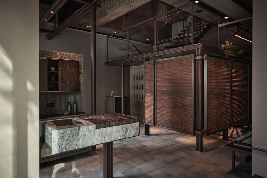 經由鏽化的鐵皮、竹片編織、碳化藺草壁板的巧妙運用,展現材質的純粹之美,讓每一處都充滿時間的韻律,與餐廳的精緻料理完美呼應。