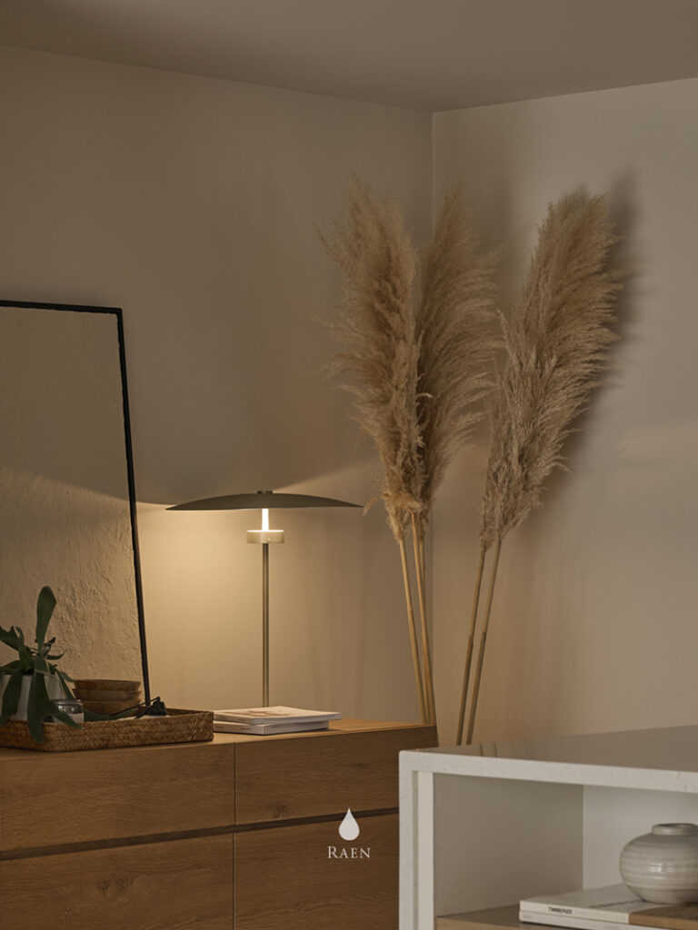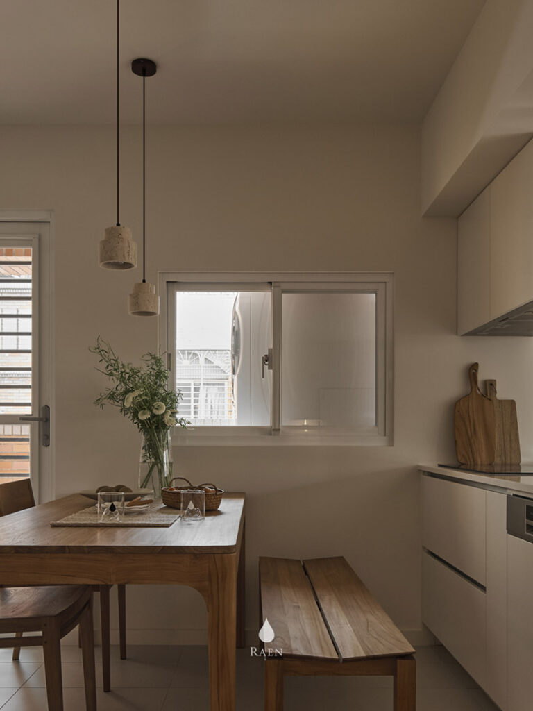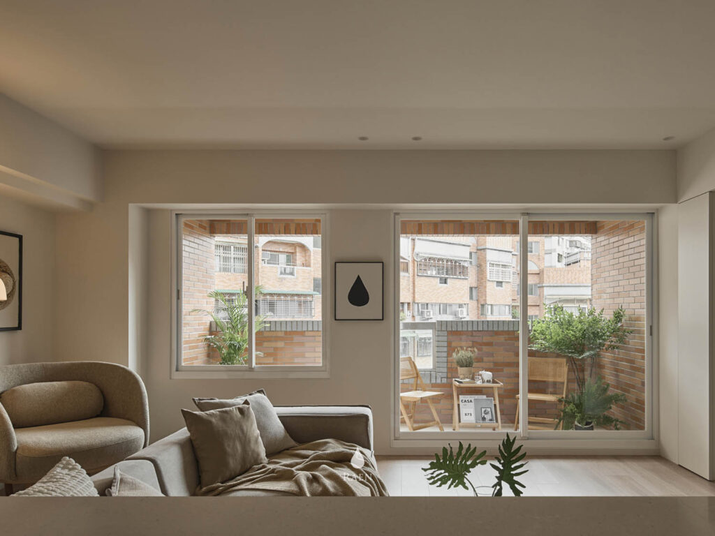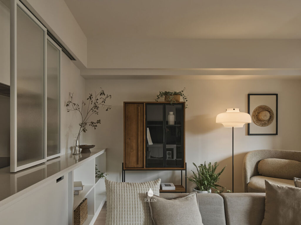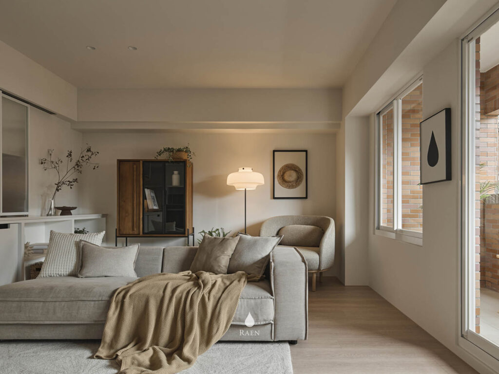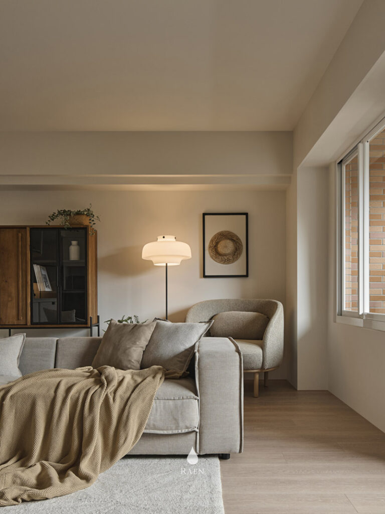 客廳中央選用丹麥Noora沙發,羽絨填充坐感,提供舒適的擁抱感。溫潤的老柚木邊櫃也為空間增添質樸氣息!最珍貴的大面採光,讓陽光充盈室內,如同溫醇的奶茶灑上淡淡金箔。