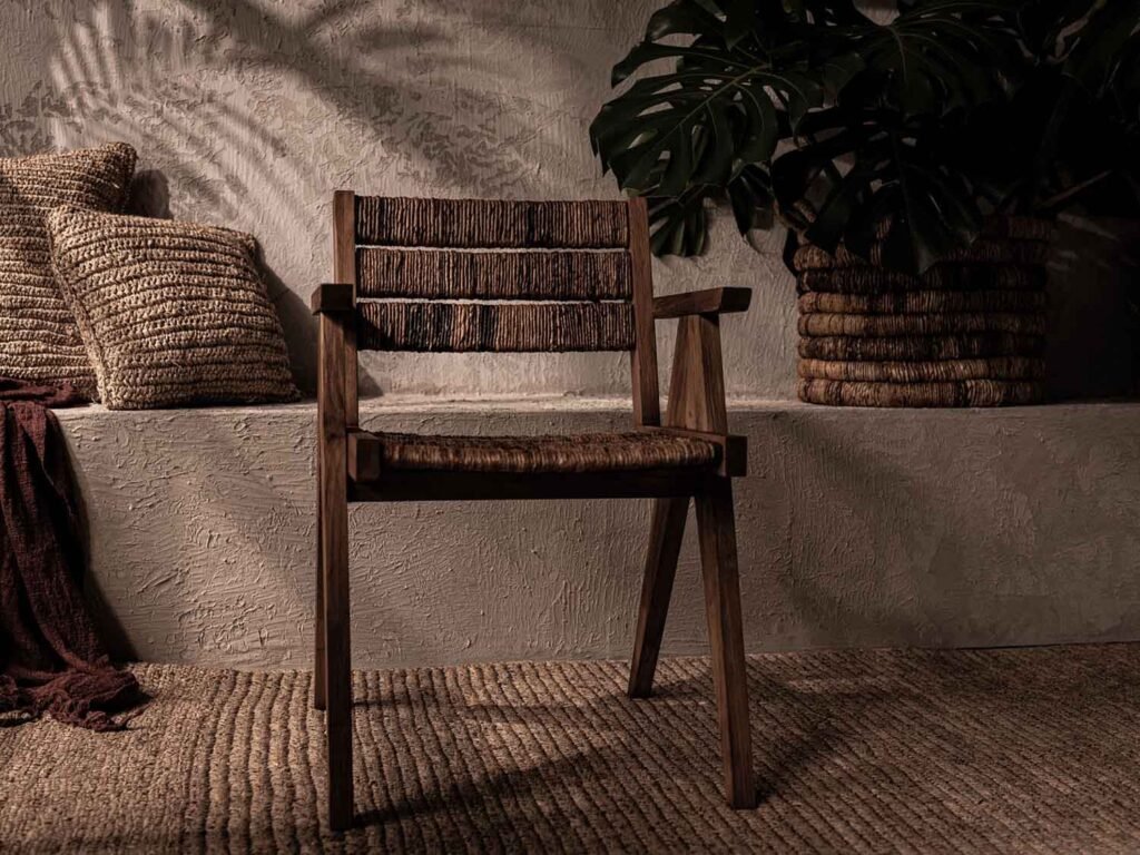 Caterpiller系列包括了許多經典設計的椅子和凳子,以實心的回收老柚木作為結構,結合由當地工匠手工編織的蕉麻纖維,在日常中優雅注入海島的度假風情。