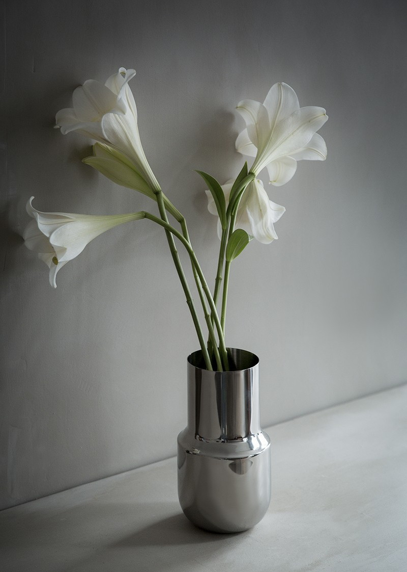 帶有漂亮圓弧線的筒狀花器,拋光至鏡面的銀色光澤流露出優雅的氣質,減低了不銹鋼的偏冷調性。無論是放滿一束艷麗的鮮花,或幾枝綠植隨意散放,都能輕鬆改變室內的情調。