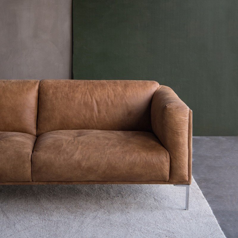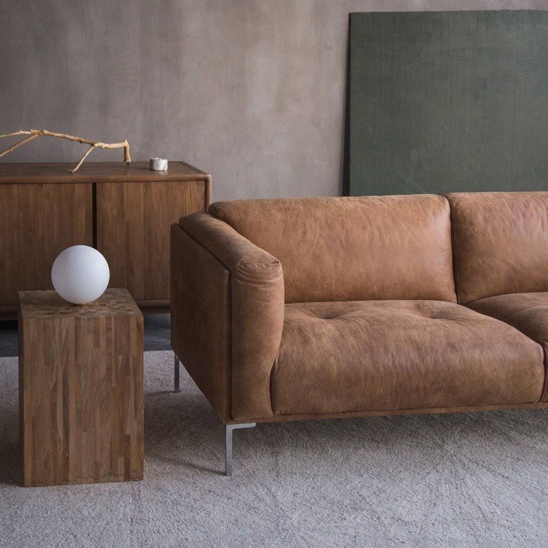 材質:歐洲櫸木框架、高密度泡棉+羽絨、嚴選磨砂半苯染頭層牛皮(義大利工坊鞣製)